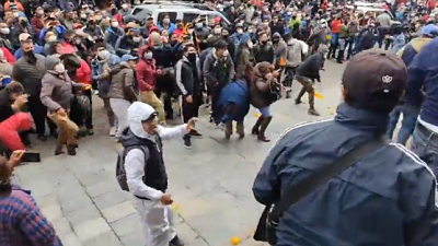 Invitación de Pumari a insultarlo y agredirlo terminó a empujones, tomatazos y naranjazos