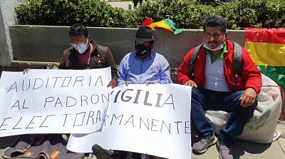 Rafael “Tata” Quispe y activistas instalaron este viernes una vigilia frente al Tribunal Supremo Electoral (TSE) en demanda de que se audite el Padrón Electoral y en respaldo a la vocal Rosario Baptista, quien denunció presuntas irregularidades.