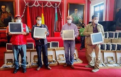 El gobernador de Tarija, Adrián Oliva, entregó este jueves 22 monitores multiparamédicos al Hospital Regional San Juan de Dios, para reforzar las salas de terapia intensiva en el marco de la lucha contra la pandemia de coronavirus.