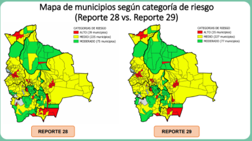 "Según el Reporte 28, se registraron 39 municipios con Riesgo Alto, mientras que el Reporte 29 reporta 35, además de 227 municipios con Riesgo Medio y 77 con Riesgo Moderado", detalla ese informe.