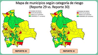 A la fecha, "hay 34 municipios con riesgo alto, 223 municipios con riesgo medio y 82 municipios con riesgo moderado", según el Trigésimo Reporte del Índice de Riesgo Municipal, disponible en el sitio web https://www.minsalud.gob.bo/boletines-c