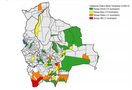 El Ministerio de Salud publicó este viernes nuevos indicadores de riesgo de COVID-19 a nivel municipal, en el cual sólo tres de los 339 municipios del país se encuentran en Riesgo Alto: Padilla en Chuquisaca, Cochabamba en el departamento del mismo nombre y San Pablo de Lípez en Potosí.