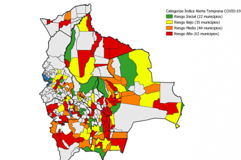 En específico, el informe reporta que los municipios en riesgo alto son: Camargo, El Villar, Huacareta, Monteagudo, Muyupampa, Padilla, Sucre, Villa Alcalá y Villa Serrano en Chuquisaca; Chulumani, El Alto, La Paz y Viacha en el departamento de La Paz; Aiquile, Cochabamba, Colcapiruha y Tolata en Cochabamba; Antequera, Challapata, Eucaliptus, Hua