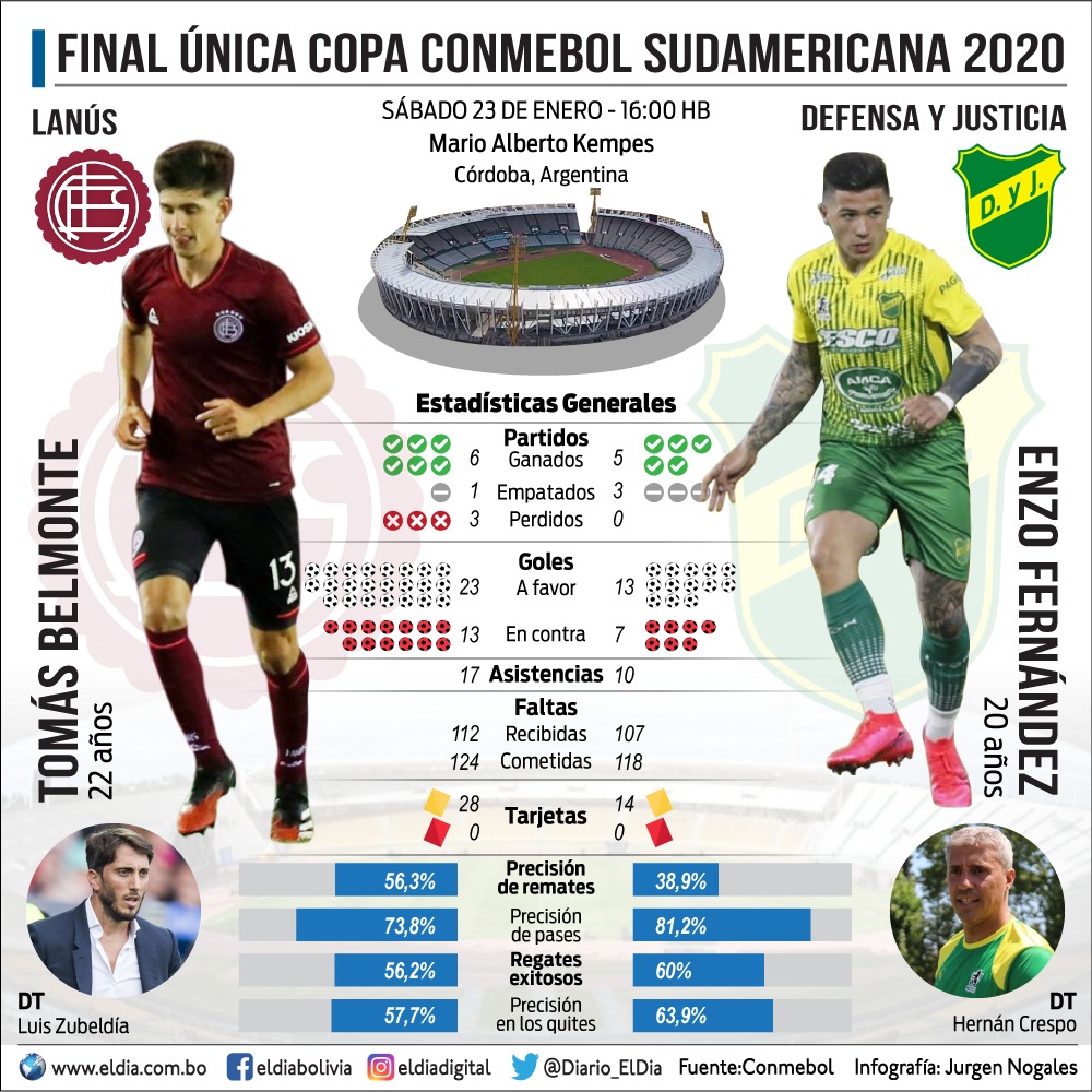 La ansiada espera terminó. En una fecha atípica a raíz de la pandemia del coronavirus, este sábado se conocerá a un nuevo ganador de la Copa Sudamericana, segundo certamen en importancia en la región. Desde las 16:00 (hora boliviana), en el Mario Alberto Kempes, Lanús chocará ante Defensa y Justicia. El árbitro será el venezolano Jesús Valenzuela (reemplazó al uruguayo Leodán González) y el chileno Julio Bascuñán estará a cargo del VAR.