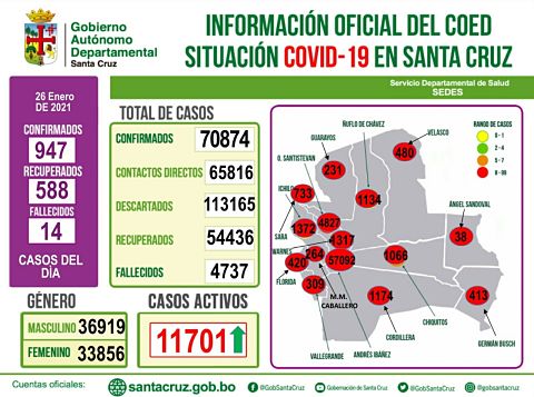 El Servicio Departamental de Salud (SEDES) reportó 947 nuevos casos de COVID-19 en las últimas 24 horas. Además, se lamentó 14 decesos a causa de la enfermedad.