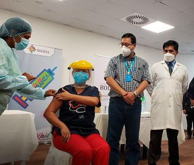 Lorgia Gutiérrez, con más 15 años de servicio en terapia intensiva, recibió este sábado la primera vacuna Sputnik V contra el COVID-19 en el hospital de tercer nivel Hernán Messuti Ribera de Cobija, del departamento amazónico de Pando, la tercera región en iniciar la inmunización en el país, después de Santa Cruz y La Paz.