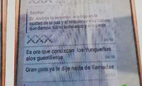 Desde entonces, su familia recibió mensajes enviados desde el celular de Beymar, en los cuales se pedía 50 mil bolivianos a cambio de entregar con vida al adolescente, según informó el jefe policial.