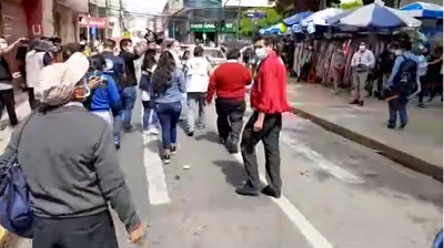 En la muchedumbre hubo personas que se identificaron como comerciantes y funcionarios quienes se concentraron en la Plaza 14 de Septiembre, y desde allí le lanzaron cáscaras de frut