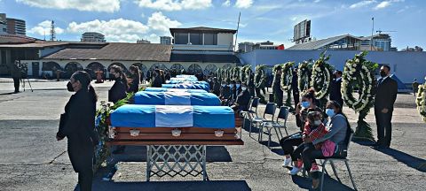 Los restos de los migrantes llegaron por vía aérea a esta capital, donde se realizaron las honras fúnebres con la presencia de familiares de las víctimas y del presidente Alejandro Giammatti junto a otros representantes del Gobierno.