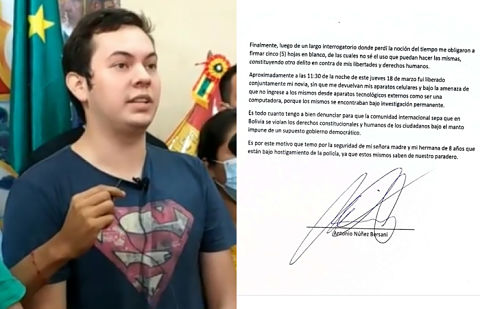 Antonio Núñez Berzani hijo del exministro de la Presidencia Yerko Núñez, denunció a través de una carta dirigida a organismos internacionales de derechos humanos, que fue víctima de secuestro y haber sido obligado a firmar cinco hojas en blanco, luego de ser aprehendido sin orden judicial, durante un operativo efectuado por policías civiles el pasado 18 de marzo en la ciudad de Trinidad.