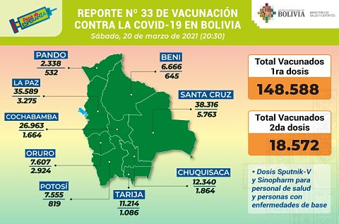 El Ministerio de Salud y Deportes reportó este sábado que la cifra de inmunizados con la primera dosis de la vacuna anticovid ascendió a 148.588, mientras que el número de vacunados con la segunda dosis subió a 18.572.