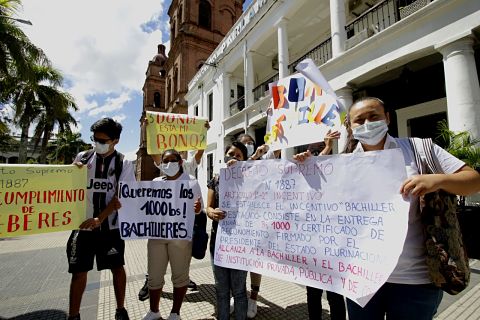 Estudiantes destacados protestan en la plaza exigiendo su bono al bachiller destacado