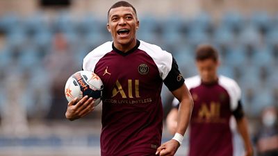 Kylian Mbappe anotó su gol 21 de la temporada este sábado para el campeón vigente Paris Saint-Germain, que goleó 4-1 a Estrasburgo y quedó como escolta a tres puntos de Lille.