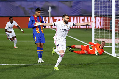 La primera parte del cotejo tuvo un claro dominador: el dueño de casa impuso las condiciones, generó las mejores ocasiones y se fue en ventaja al vestuario. La apertura del marcador fue al minuto 13 por una genialidad de Karim Benzema, quien taqueó un buscapié de Lucas Vázquez en el primer palo tras una buena bola profunda por derecha de Federico Valverde. Los dirigidos por Zinedine Zidane gozaron de más claridad y, además, con fortuna. Un tiro libre ejecutado en el borde del área grande por Toni Kroos se desvió en Sergiño Dest y descolocó a Jordi Alba, quien no pudo sacarla en la línea de gol.