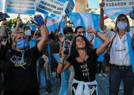 Con banderas argentinas y pancartas contra el presidente Alberto Fernández, los manifestantes centraron sus reclamos en la suspensión por 15 días de las clases presenciales en las escuelas, dispuesta por decreto y que regirá a partir del lunes en la capital y su periferia, epicentro de los contagios.