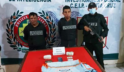 Un informe de Inteligencia procesado por agentes del Centro Especial de Investigación Policial (CEIP), acerca el suministro de droga y armas dentro el penal de Palmasola, permitió la aprehensión este martes, de Rider Adrián Denker Saavedra (32) y Rosendo Añez Medina (29), supuestos miembros de una banda de bolivianos y extranjeros.