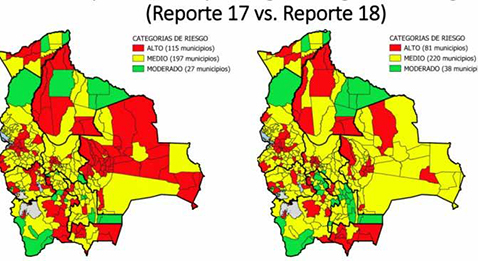 El número de municipios con riesgo alto de contagios COVID-19 bajó de 115 a 81 en la última semana y La Paz aparece entre los más afectados, según el Decimoctavo Reporte del Índice de Riesgo Municipal publicado ayer viernes por el Ministerio de Salud.