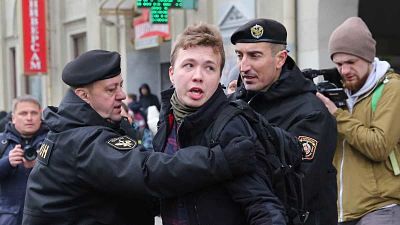 Las autoridades bielorrusas han detenido este domingo en el aeropuerto de Minsk al periodista Roman Protasevich, perseguido por el régimen de Aleksandr Lukashenko, después de que el avión en el que viajaba se viera obligado a aterrizar de emergencia en la capital bielorrusa. La aeronave de Ryanair, que volaba sobre el país en ruta a Lituania desde Grecia, recibió la notificación de las autoridades bielorrusas de una “potencial amenaza de seguridad” a bordo, según la aerolínea irlandesa. El avión, un Boeing 737-800, fue escoltado a tierra por un caza de combate por orden directa del presidente bielorruso, según el servicio de prensa de Lukashenko. En el aeropuerto de Minsk, los servicios especiales bielorrusos no han encontrado explosivos en el aparato. El inaudito incidente y el arresto del destacado bloguero crítico con el régimen ha provocado la indignación internacional.