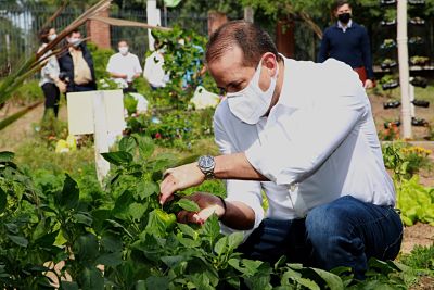 El gobernador Luis Fernando Camacho visitó uno de los huertos donde se cosecharon hortalizas y verduras, listas para preparar, mientras eran informados por los funcionarios y los voluntarios sobre este programa que beneficia a los barrios y provincias del departamento.