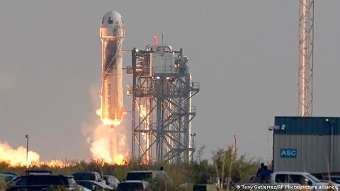 "#NewShepard está en la plataforma. El equipo de lanzamiento ha completado el despliegue del vehículo esta mañana y los preparativos finales están en marcha", tuiteó la compañía el martes (20.07.2021) temprano en lo que fueron las horas previas al lanzamiento.