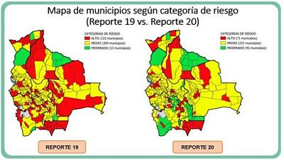 El departamento con el mayor número de municipios en alto riesgo de contagios es La Paz, con 12 comunas, seguido de Potosí y Santa Cruz, ambos con 10, Cochabamba y Tarija con nueve, en Beni ocho municipios
