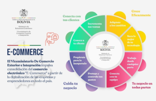 Como parte de las políticas encaradas desde el Ministerio de Relaciones Exteriores en torno a la consolidación de la Diplomacia Comercial, el Viceministerio de Comercio Exterior e Integración impulsa la consolidación del Comercio Electrónico a partir de la Digitalización de las MIPYMES en Bolivia.