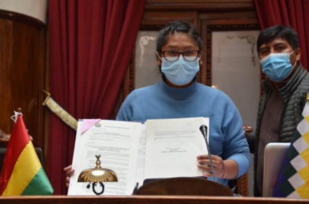 La presidenta de la Asamblea Legislativa Plurinacional (ALP), Eva Copa, promulgó hoy dos leyes: la que autoriza el uso de dióxido de color para tratar el coronavirus y también el de la Permanencia Obligatoria en Territorio Nacional del Presidente, Vicepresidente, Ministros de Estado, Gobernadores, Alcaldes y Máximas Autoridades Salientes, además de asambleístas plurinacionales, departamentales y concejales por el espacio de tres meses una vez que dejen el cargo.