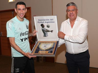 El delantero Ángel Di María recibió este viernes de parte de la AFA una plaqueta de reconocimiento por su carrera en el seleccionado argentino, con el que mañana jugará la final de la Copa América ante Brasil en el estadio Maracaná, de Río de Janeiro. "Di María recibió una plaqueta en reconocimiento...