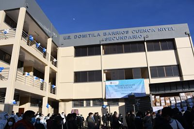 El presidente del Estado Plurinacional de Bolivia, Luis Arce, entregó la mañana de este lunes la infraestructura de la Unidad Educativa Domitila Barrios en el municipio de Sacaba del departamento de Cochabamba. “Estamos contentos de haber concluido, porque tenemos un lema: ‘obra concluida, obra 100%...