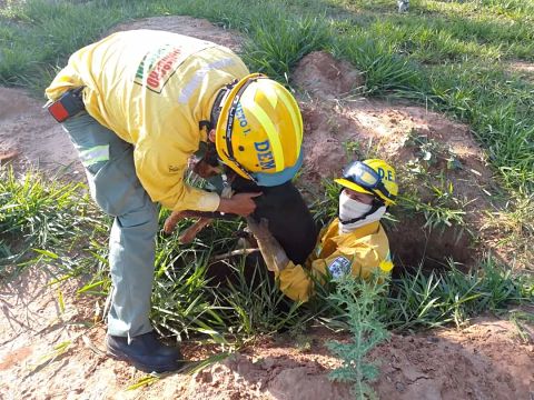 Un equipo de Bomberos Municipales rescató este jueves a un perro que cayó dentro de un hoyo en el barrio La Morita, altura d...