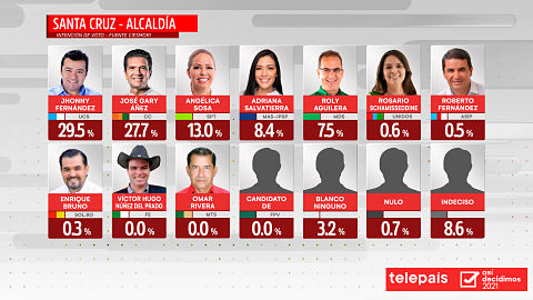 El candidato de Unidad Cívica Solidaridad (UCS), Jhonny Fernández se mantiene a la cabeza en la intención de voto con 29,5%, pero la gran sorpresa la da Gary Añez de Comunidad Ciudadana (CC), que trepó del cuarto a segundo lugar con 27,7%, según la segunda encuesta elaborada por Ciesmori y difundida...