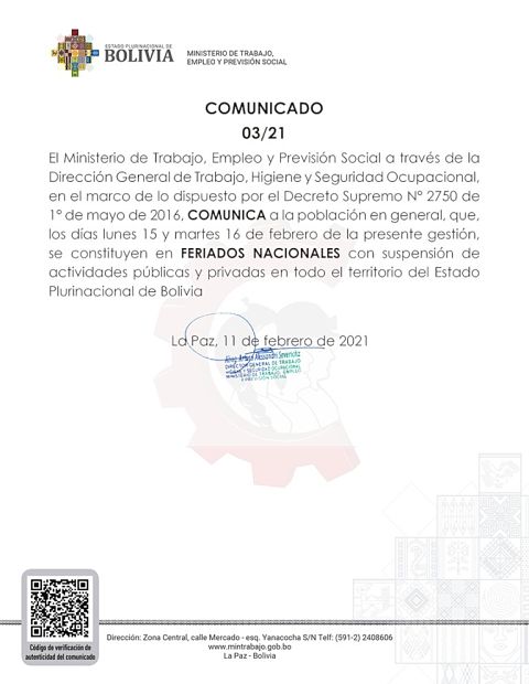 El Ministerio de Trabajo, Empleo y Previsión Social, comunicó este jueves a la población en general que el lunes y martes de la próxima semana son feriados nacionales en todo el territorio por Carnaval....