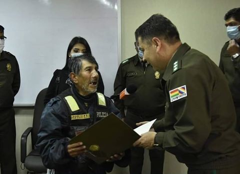 El comandante general de la Policía, Johnny Aguilera, recibió el miércoles la visita de Juan Carlos Arancibia, de 74 años, a quien se reconoció como policía honorario de Tránsito, por dirigir el tráfico vehicular desinteresadamente en la zona norte de La Paz. "Hoy nos visitó (Arancibia) en el Comand...