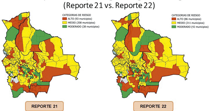 Bolivia inicia octubre con 86 municipios en la categoría riesgo alto de contagios de coronavirus, 211 en riesgo medio y 42 en riesgo moderado, según el vigesimosegundo Índice de Riesgo Municipal del Ministerio de Salud. Con relación a la semana pasada, bajó la cifra de poblaciones con riesgo alto. ...