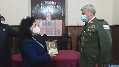 La alcaldesa de Sucre, Rosario López, entregó el reconocimiento del Escudo de Armas al comandante departamental de la Policía en Chuquisaca, Jesús Gonzalo Lazo, por su notable trabajo de servicio a la comunidad en la lucha contra la pandemia de coronavirus. "Destacar el gran trabajo de coordinación ...