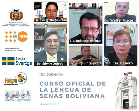 La Dirección de Protección a las Víctimas, Testigos y Miembros del Ministerio Público (DPVTMMP) informó que en coordinación con la Escuela de Fiscales del Estado (EFE), se desarrolla, del 27 de agosto al 12 de septiembre del 2020, el primer “Curso Oficial de la Lengua de Señas Boliviana” modalidad v...