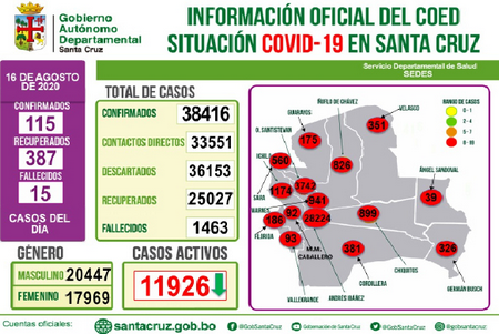 Al culminar la jornada del 16 de agosto, Santa Cruz reportó 115 nuevos casos de COVID-19, además de 387 recuperados y 15 fallecidos, cuyos datos hace la sumatoria de 38.419 casos acumulados desde el inicio de la pandemia y 11.926 activos en el momento, 25.027 recuperados y 1.463 fallecidos. Cifras....