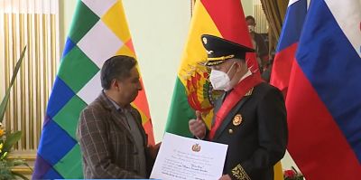 El canciller de Bolivia, Rogelio Mayta, impuso este viernes la condecoración con la Orden Civil, Libertador Simón Bolívar en el Grado de Gran Cruz, al embajador de Rusia, Vladimir Sprinchan, tras cumplirse 122 años de relación diplomática entre ambos países. En el acto, el Canciller boliviano dijo q...